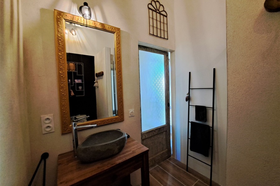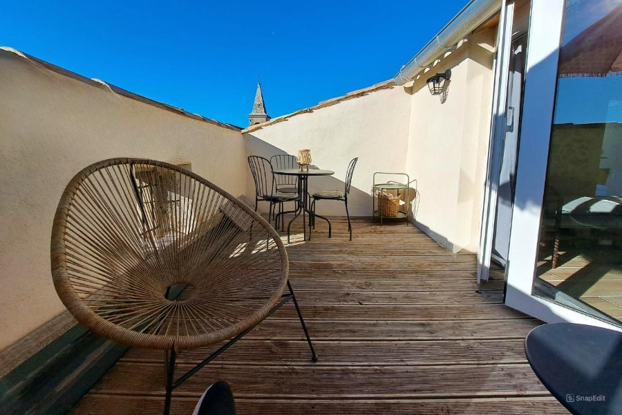 Le gîte Jasmin est un bel appartement en pierre entièrement rénové. De la cuisine/salle à manger, il y des portes-fenêtres menant à la belle terrasse privée
