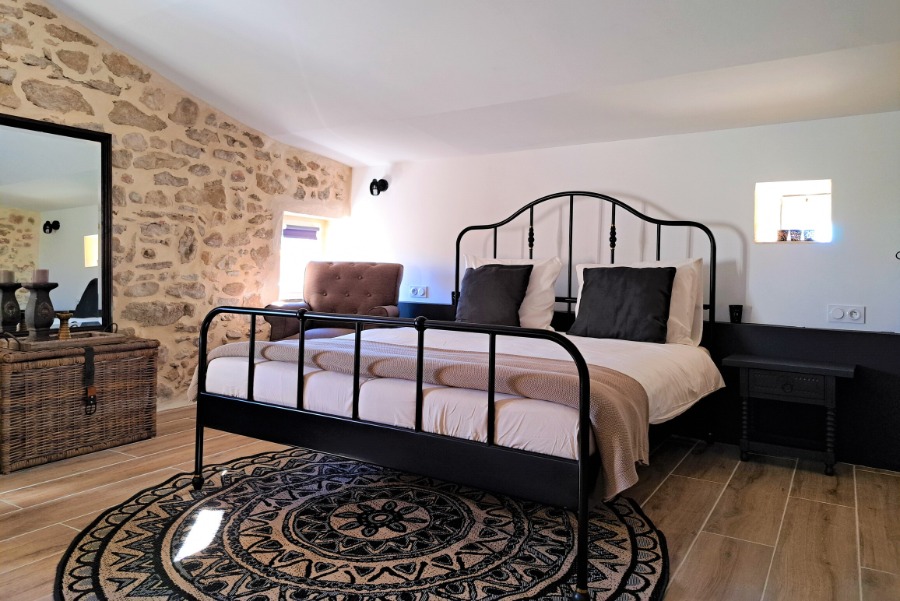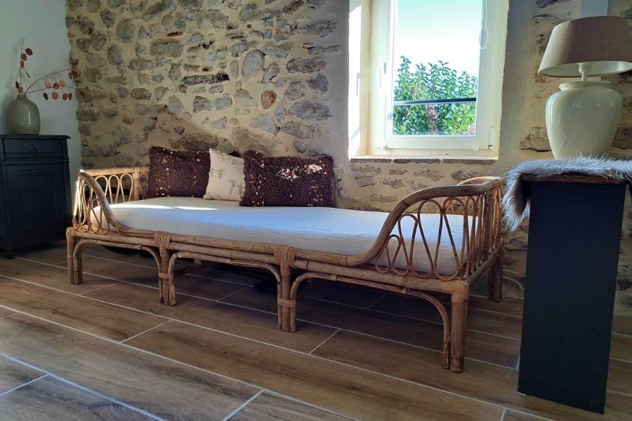 design rustique ave une chambre séparée avec un lit double 160x200 cm, un fauteuil relaxant, une grande armoire et un "daybed", adapté à un