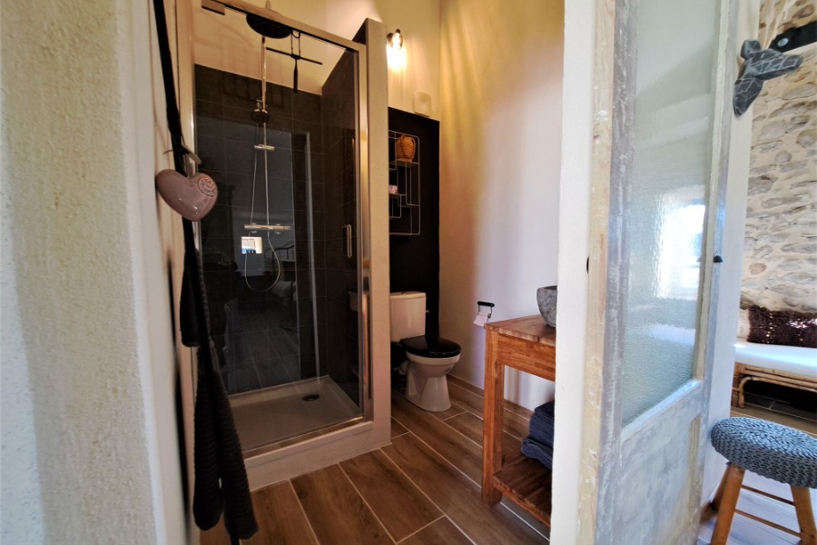 Une salle de bain séparée avec douche, WC et meuble de salle de bain. Le gîte dispose un airco et est au 2ème étage.