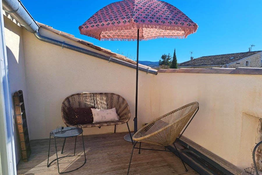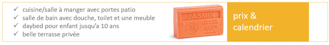 Le gîte Jasmin est un bel appartement en pierre entièrement rénové. De la cuisine/salle à manger, il y des portes-fenêtres menant à la belle terrasse privée