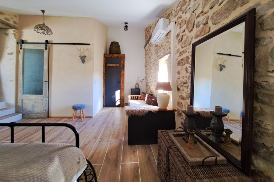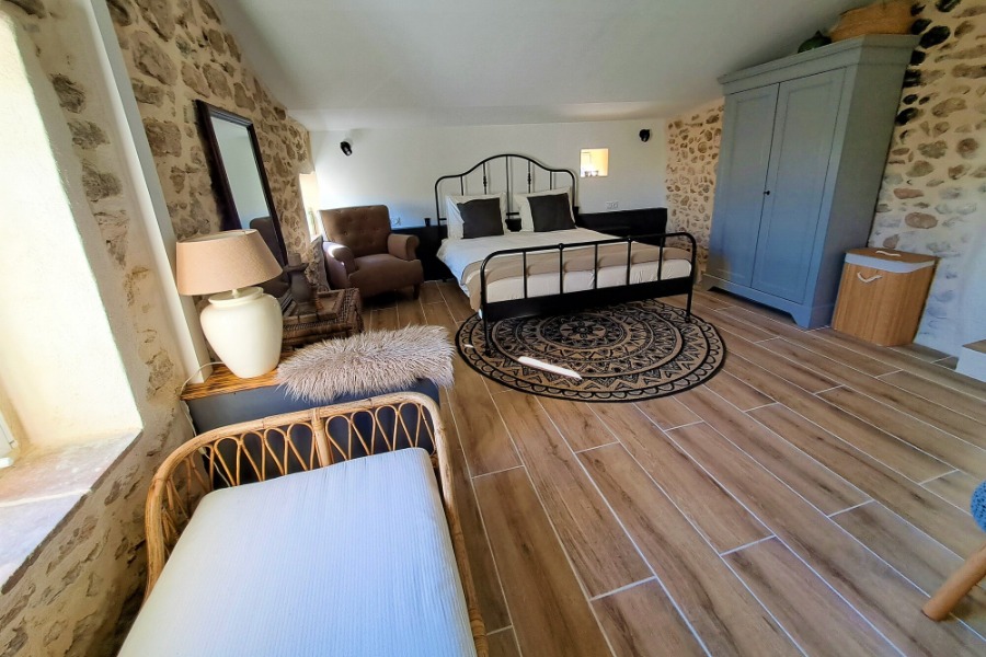design rustique ave une chambre séparée avec un lit double 160x200 cm, un fauteuil relaxant, une grande armoire et un "daybed", adapté à un